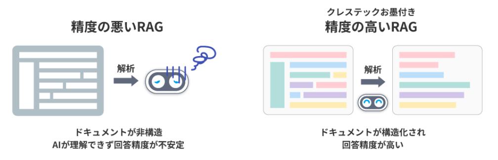 そしてRAG型AIは、自社の正しいナレッジベースから必要な情報だけを検索・抽出し、その範囲内で回答を生成する仕組みです。信頼できる情報源から回答を生成するため、インターネット上に存在する競合他社の製品情報をピックアップして回答してしまうような事故は起こりません。
