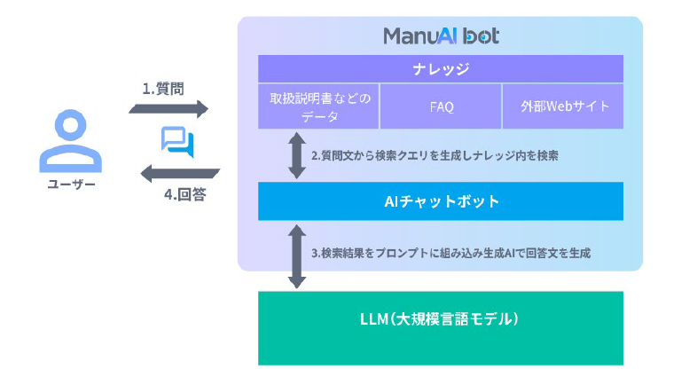 ManuAI bot では、企業が独自に所有する、信頼できる情報を検索し、それを基に回答を生成します。