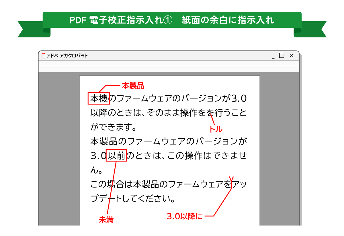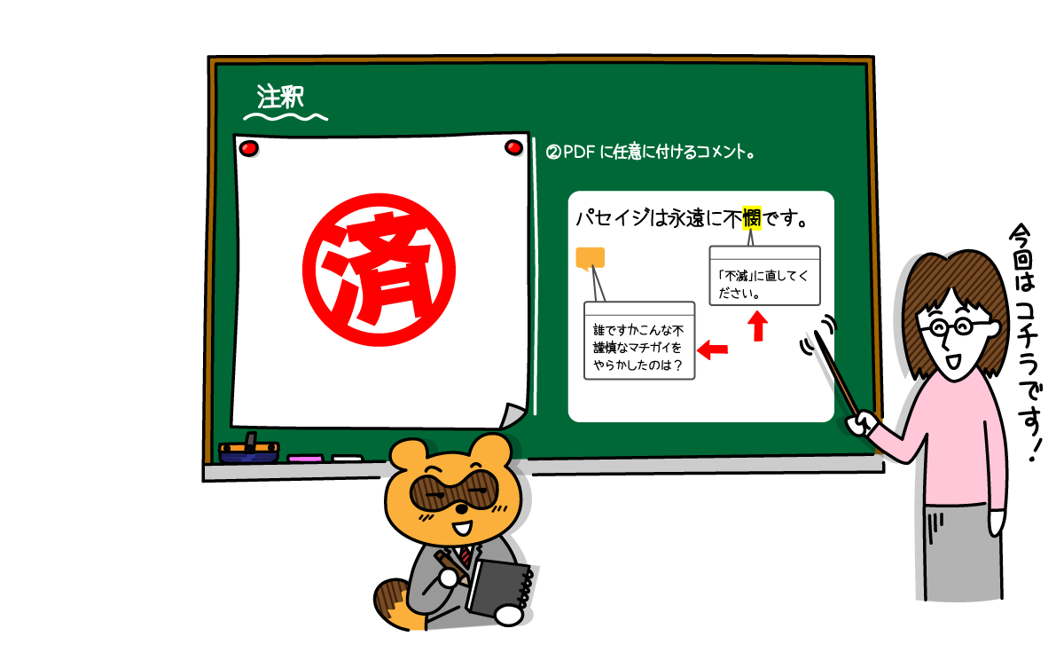 校正紙の紙面の余白にコメントを書き込むのとまったく同じことを PDF 文書で再現するアプローチです。PDF ビューワーの注釈機能にある描画ツール (直線、曲線、折れ線、矩形、丸、テキスト) を総動員して、指示を余白にせっせと書き込むわけです。