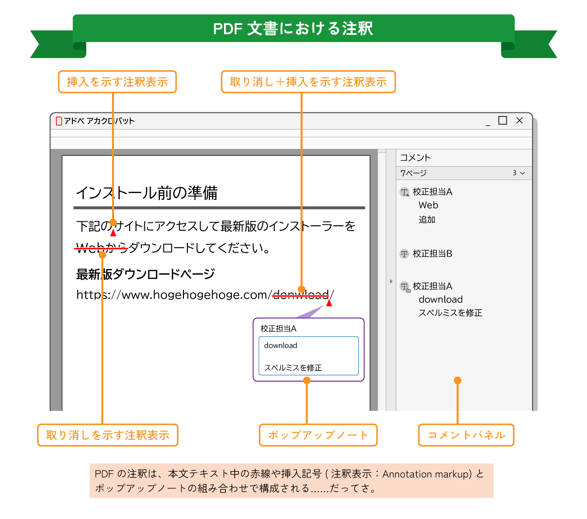 マニュアル業界では、PDF の注釈機能は「PDF 文書の校正結果のコメントや修正内容、指摘事項を入れるためのもの」として利用されています。いわゆる電子校正です。本来の注釈が「本文と同じ執筆者が著述した情報」なのに対し、PDF での注釈は「本文の執筆者とは別の人間が、文書に対して自由に意見を述べるコメント」となっていますから、本質的に意味が様変わりしています。