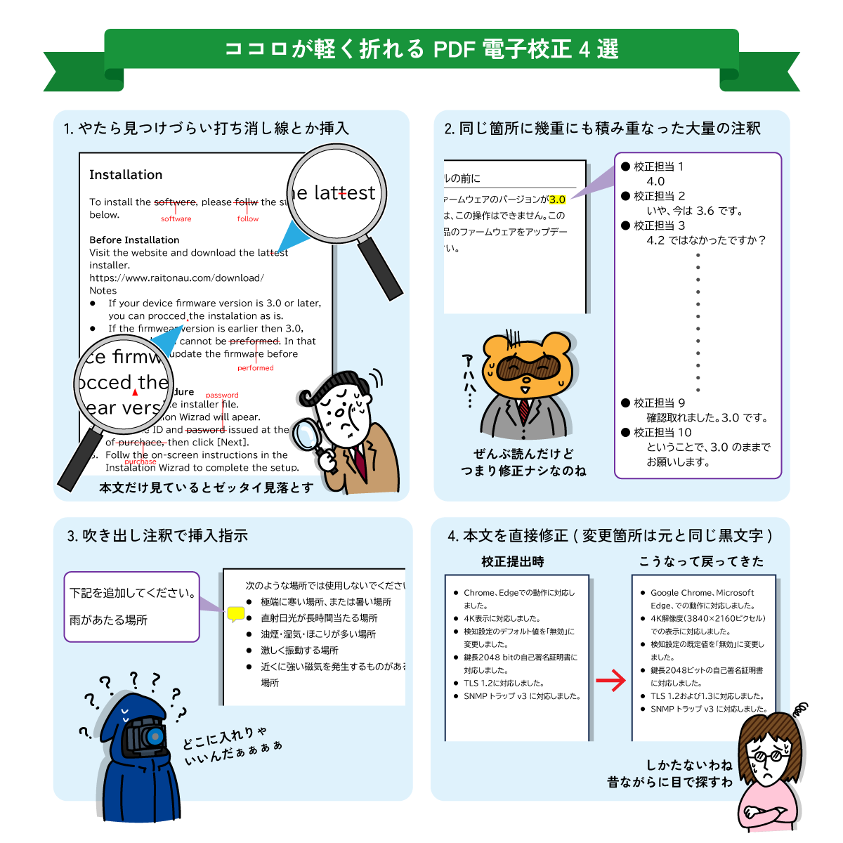 そんな PDF 文書の電子校正ですが、注釈機能を使ってどのように校正コメントを入れているかというと、これがもう千差万別です。極論すると「わかればいい」「伝わればいい」なものですから、コメントを入れる人が各自思い思いの方法で指示入れしています。それはもう、みなさん PDF ビューワーの注釈機能を駆使してさまざまな手法で指示入れしているわけです。