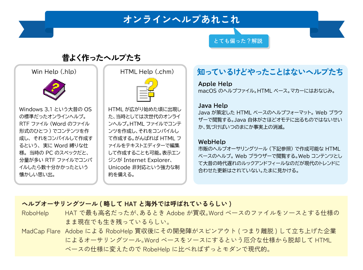 このため、OS の数だけヘルプシステムが存在し、当然ですがその数だけヘルプファイルの種類もありました。OS の開発元が提供するツールとガイドラインでオンラインヘルプを作成することができましたが、サードパーティのソフトウェアベンダーがヘルプオーサリングツールを開発・販売もしていて、なかなかの賑わいでした。