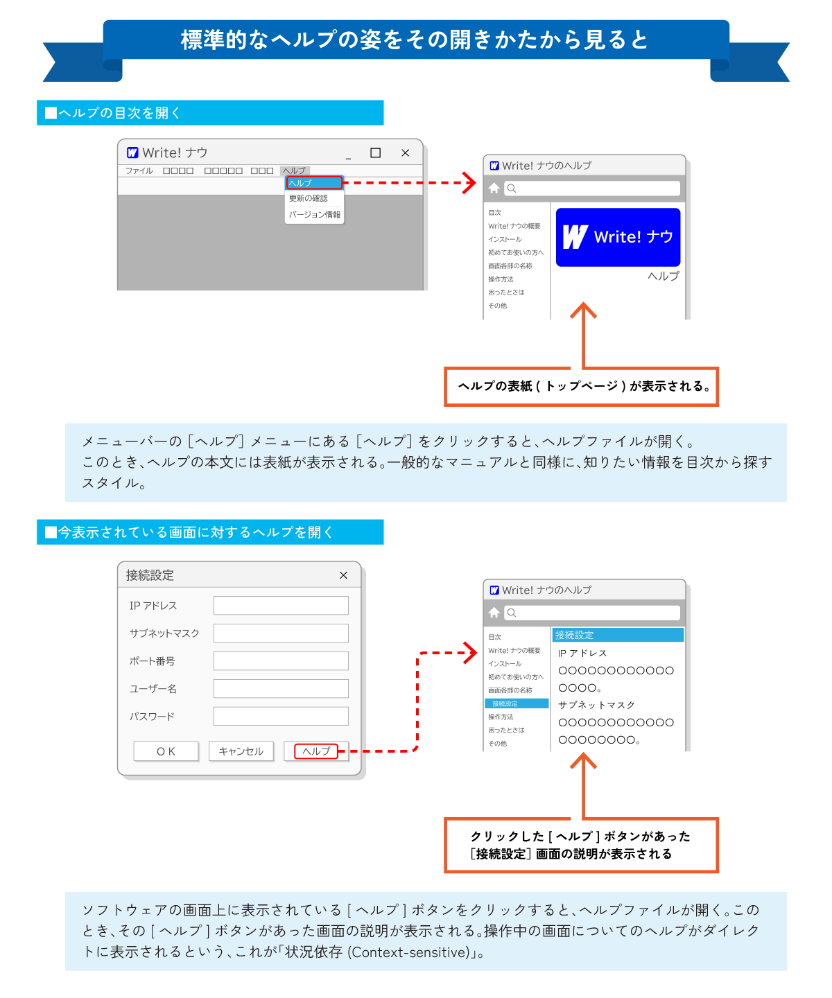 オンラインヘルプには、対象となるソフトウェアの画面や機能の説明が網羅されており、目次から目的の説明を辿ることももちろん可能ですが、表示中の画面にある [ヘルプ] ボタンをクリックしてヘルプを開いたときに、ヘルプに含まれる説明文のうち、その画面の説明をすぐに表示できます。表示中の画面という状況に合わせた動作をするから「状況依存」ということですね。この特徴を備えているのがオンラインヘルプの標準的な姿でした。