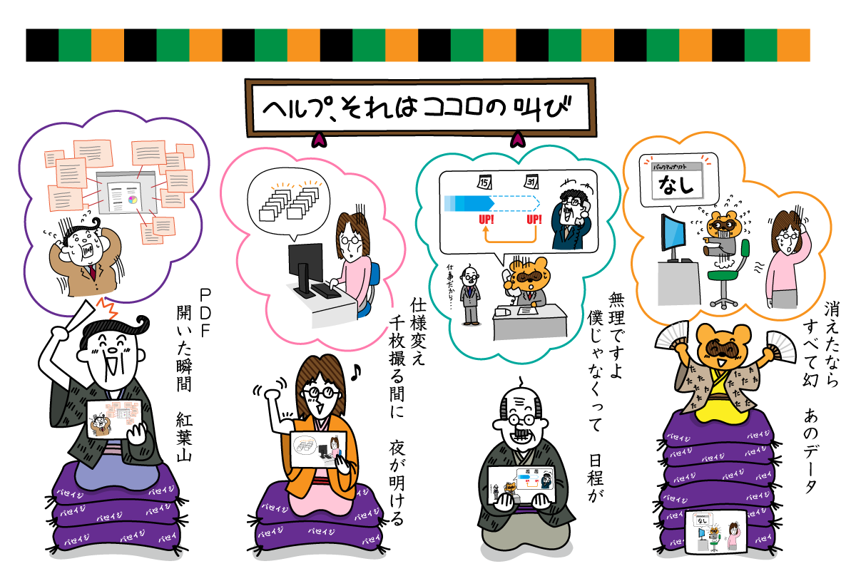 一般的に「ヘルプ」という言葉は、人手が足りない作業集団に別の誰かが支援のために参加することを指すと思います。当マニュアル業界でもその意味で使う機会はありそうなものですが、なぜか弊社ではその意味で使われる機会はあまりありません。ゼロではないと思いますが、幸いにも人は足りているのかもしれませんし (本当は万年人手不足のはずですが)、あるいは作業者が頻繁に入れ替わらないので、誰かが支援に入るケース自体が少ないかもしれません。