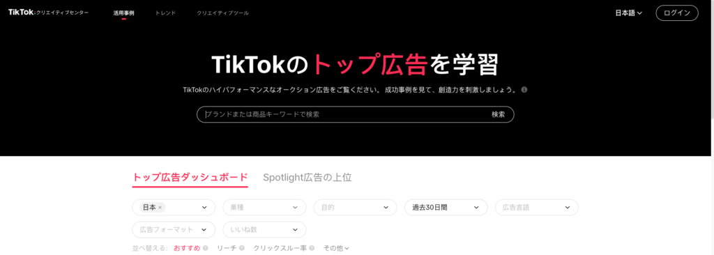 TikTokクリエイティブセンターでは、TikTok上で配信されている広告や人気のクリエイティブ事例を確認できます。業界やキーワードごとに検索でき、どのような表現や構成が使われているのかを把握できる仕組みです。
